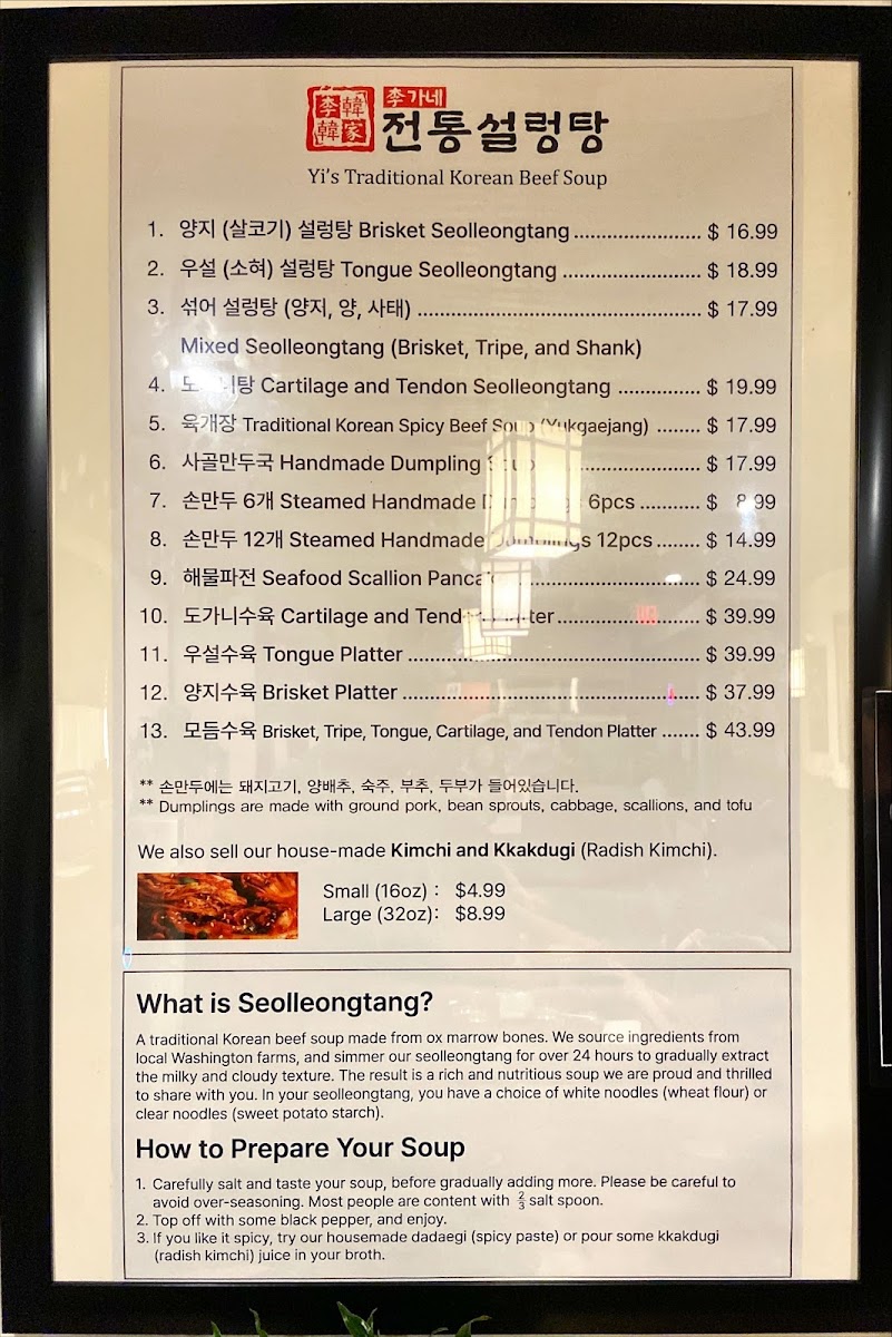 Overall, with decent pricing and a casual, welcoming atmosphere, Yi's Traditional Korean Beef Soup offers a flavorful exploration of Korean culinary heritage. The portions may lean slightly smaller than some competitors, but the quality of the ingredients and the soulfulness of the soup are undeniable draws. If you're in search of a genuine Korean beef soup experience, Yi's is poised to satisfy your cravings, amidst the warmth of a traditional dining experience.